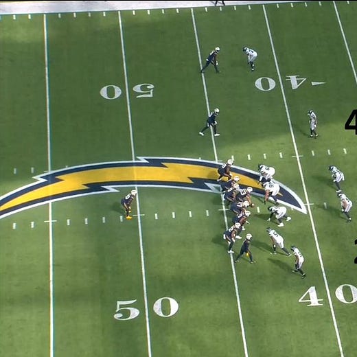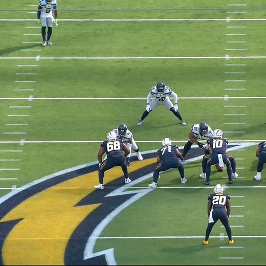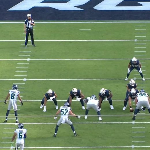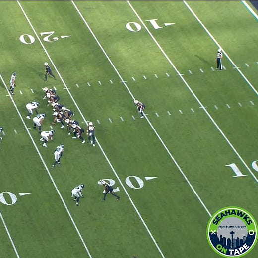 Here’s a clip showing the ass-kicking the Seahawks are doing up front in their bear, with Poona Ford driving his man back as a 4i-technique, notably more downhill than before the defensive shift. He was able to impressively win into the C-Gap when the ball went that way—the 4i part to the equation.