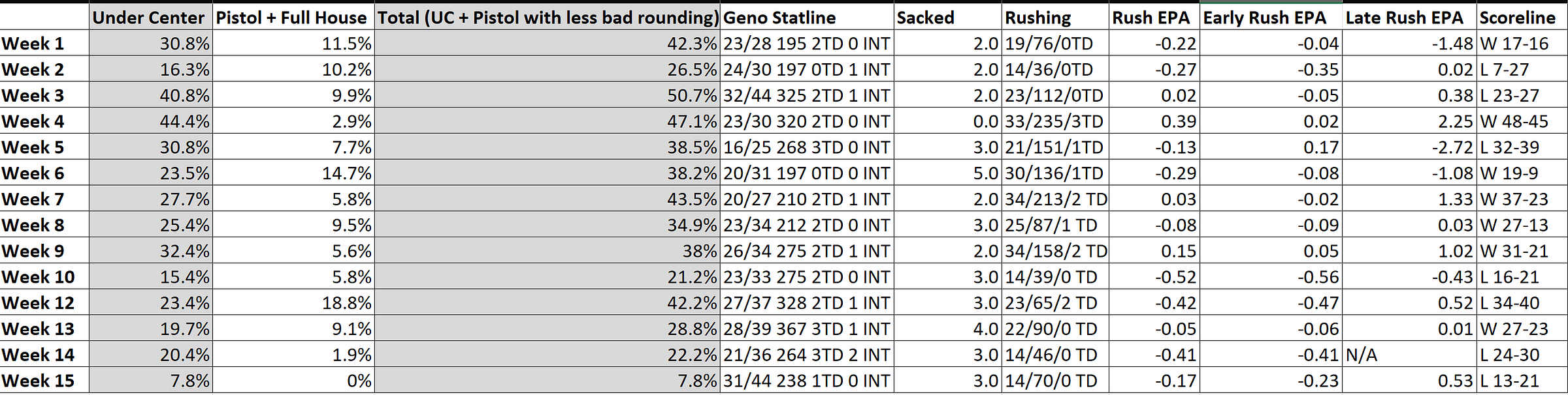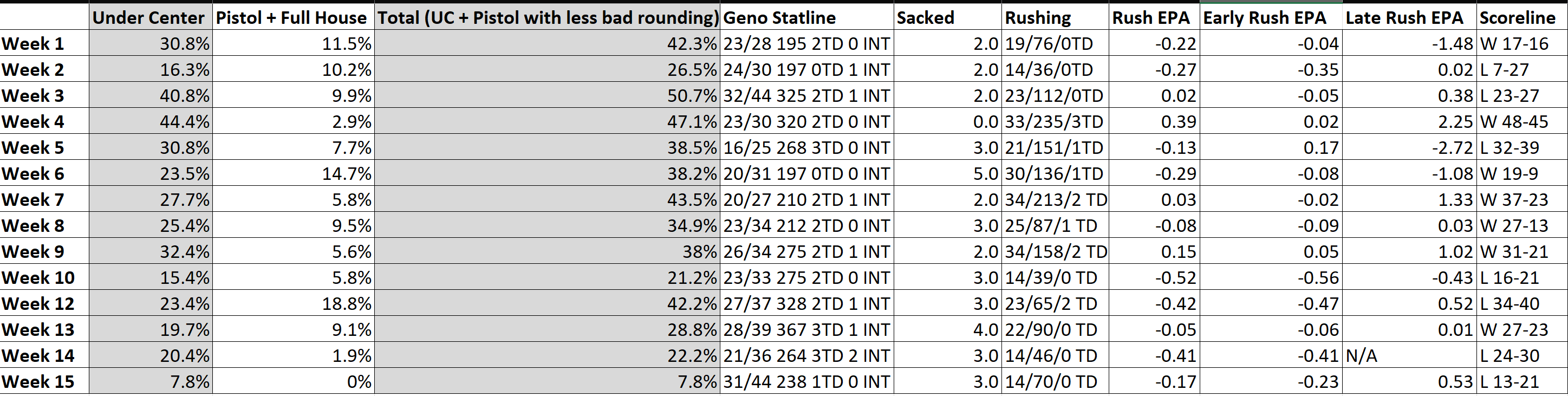 In their crucial week 15 game at home to the San Francisco 49ers, the Seahawks put Geno Smith under center just 5 times and in the pistol 0 times. This, as the data shows, was a season-low total by some margin. And Seattle’s usage of non-shotgun looks has been trending down as the 2022 season has progressed.